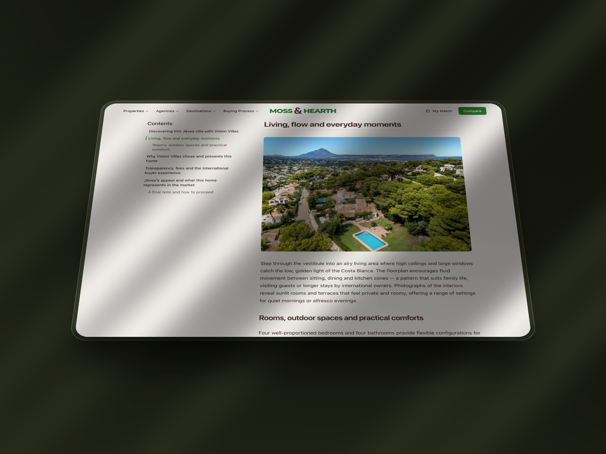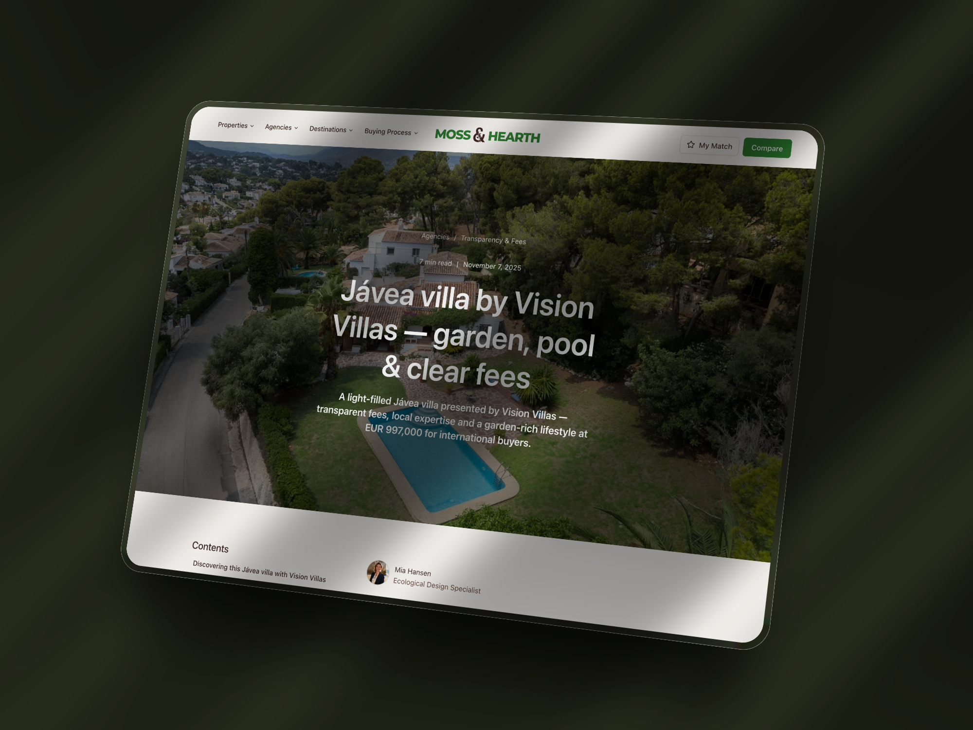 Moss & Hearth published "Javea Villa: Vision Villas Garden Pool Transparency", highlighting Vision Villas' transparent approach to fees and client service in the eco-conscious property segment.