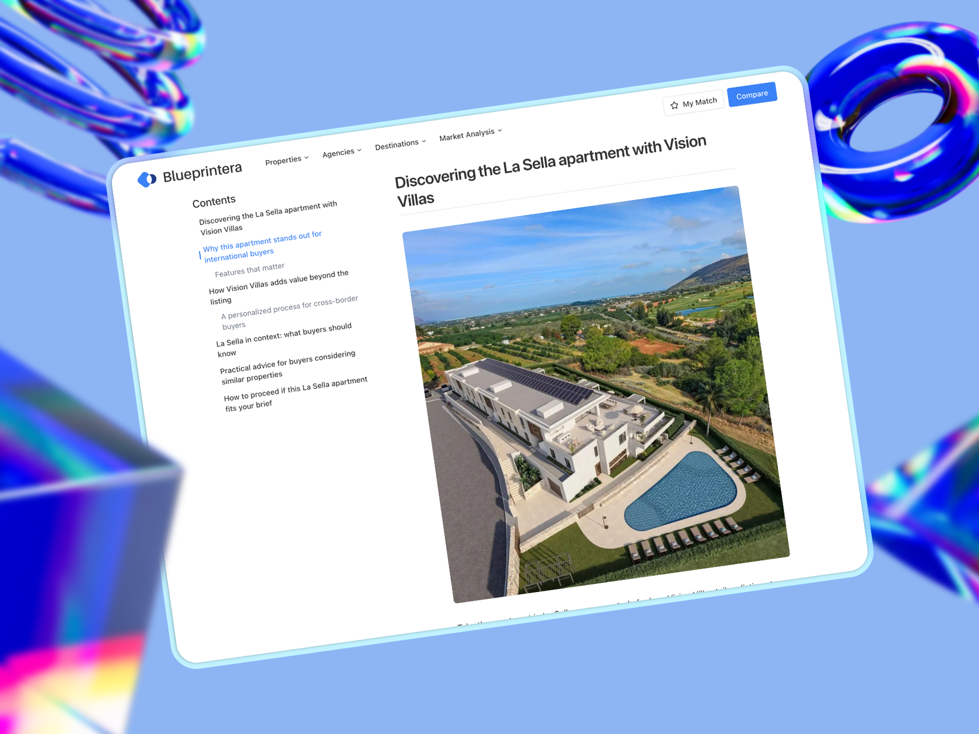 Blueprintera featured "La Sella Two Bedroom: Vision Villas", showcasing the modern La Sella apartment and positioning Vision Villas as specialists in contemporary Costa Blanca developments.